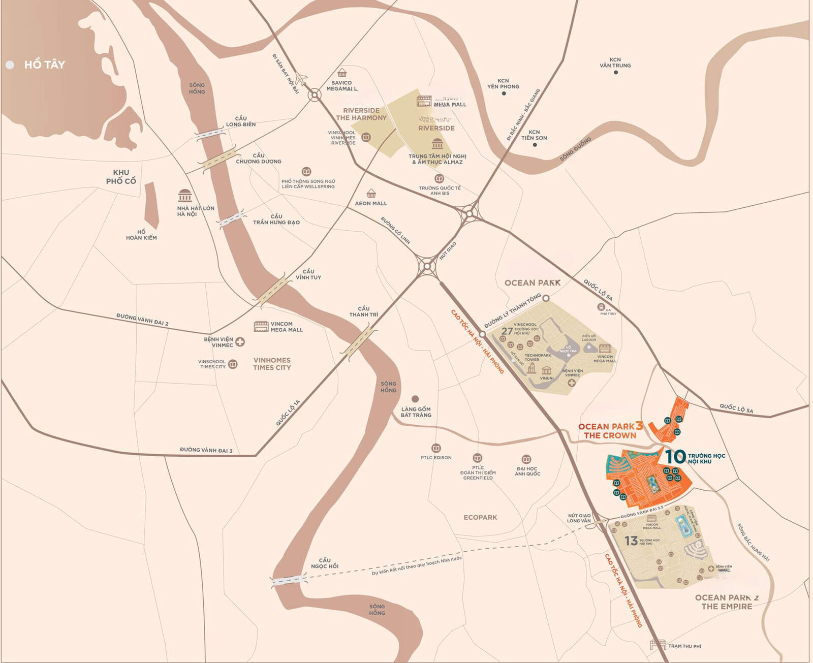 Dự án nằm tại khu vực có hạ tầng giao thông phát triển. Đối diện Ocean Park 2 qua trục đường vành đai 3.5 và cách trục đường quốc lộ 5A và cao tốc Hà Nội – Hải Phòng chỉ khoảng 300m. Nhờ vị trí thuận lợi, từ Ocean Park 3 – The Crown có thể nhanh chóng di chuyển về trung tâm Thủ đô Hà Nội.
